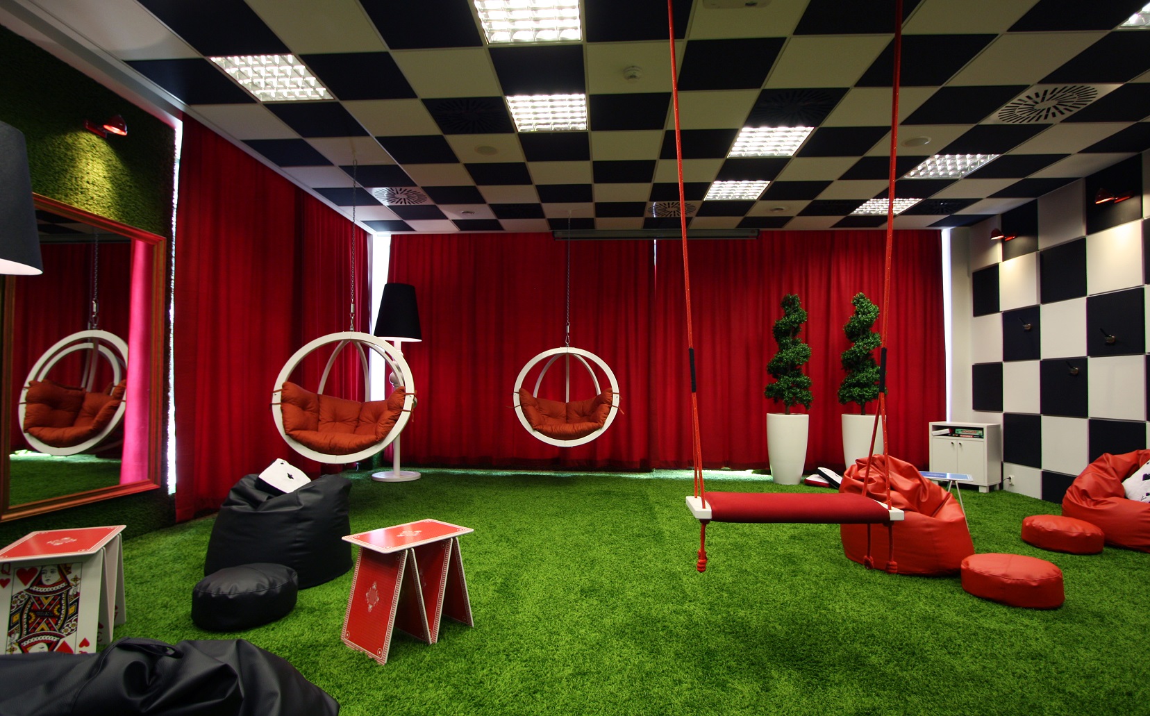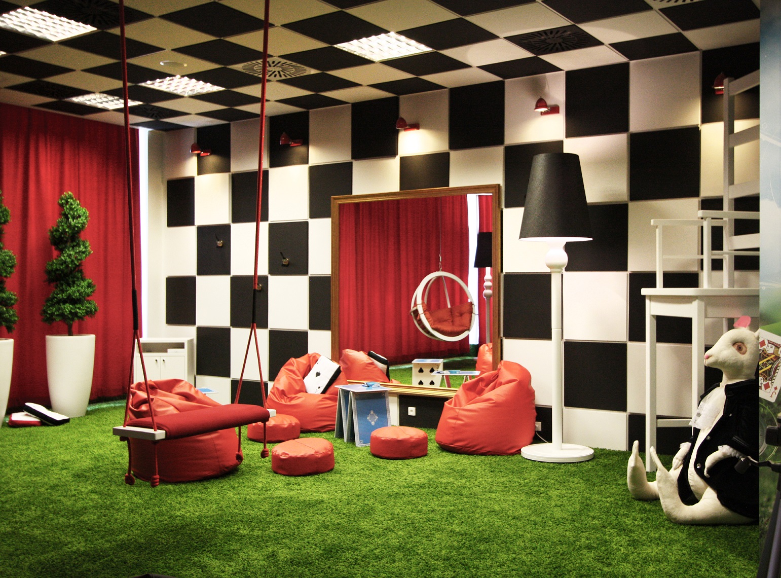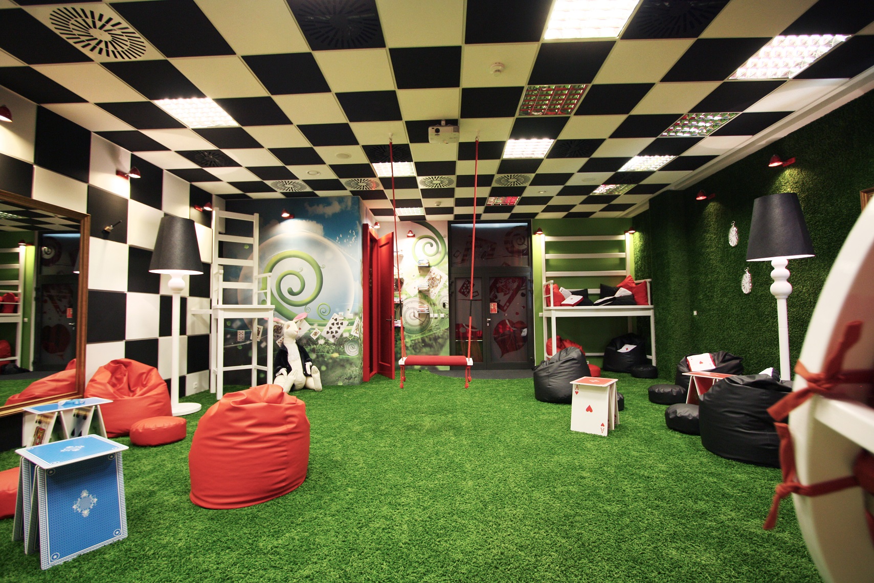Pomieszczenie o powierzchni 80m2 zaprojektował Arkadiusz Grzędzicki – właściciel biura projektowego „Projektuj wnętrza” – czerpiąc inspiracje z filmowego świata „Alicja w Krainie Czarów” stworzonego przez reżysera Tima Burtona.