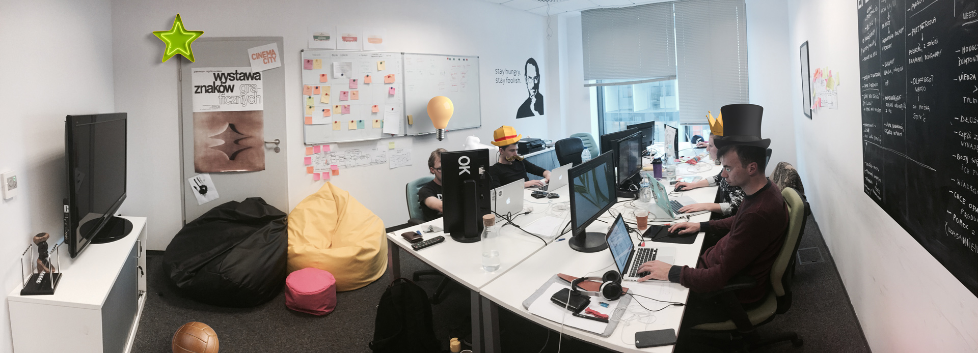 – Jedna z tablic pomaga nam w codziennym zarządzaniu projektami. Każdy z nas widzi dokładnie, jakie są priorytety w zadaniach oraz na jakim etapie w projekcie jesteśmy. Inne pomagają nam przy analizach User Experience, gdzie możemy prowadzić warsztaty z klientami dotyczące ich marki, projektu. Otaczają nas plakaty zaprojektowane w latach 70′, które pokazują ponadczasowość znaków graficznych. Dodatkowo na ścianie wisi 10 zasad Elona Muska, który jest dla nas obecnie największym wizjonerem na świecie. Nad całym zespołem czuwa namalowany na ścianie Steve Jobs. Dlaczego on? Ponieważ ciągle nam przypomina, aby się cały czas rozwijać, patrzeć szerzej i robić jak najlepsze produkty.