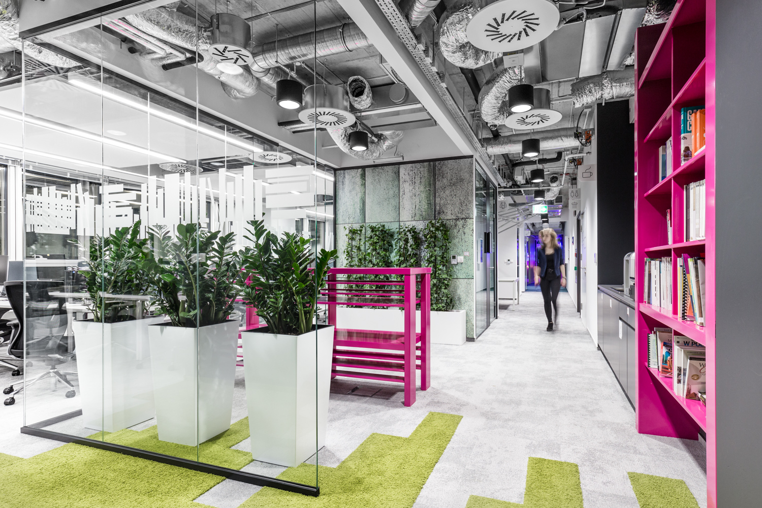 Nowa siedziba Mediacom poza innowacyjnym podejściem estetycznym zaskakuje biurową maestrią na poziomie funkcjonalnym: desk-sharing, ciągi komunikacyjne oddzielone od stref pracy indywidualnej strefami wsparcia, czyli salami spotkań, budkami telefonicznymi, czy miejscami do spotkań ad-hoc. Przestrzeń czytelnie podzielona na strefy pracy indywidualnej, strefy projektowe, liczne przestrzenie networkingowe to tylko niektóre z rozwiązań, które znaleźć można w biurze przy ul. Wołoskiej.