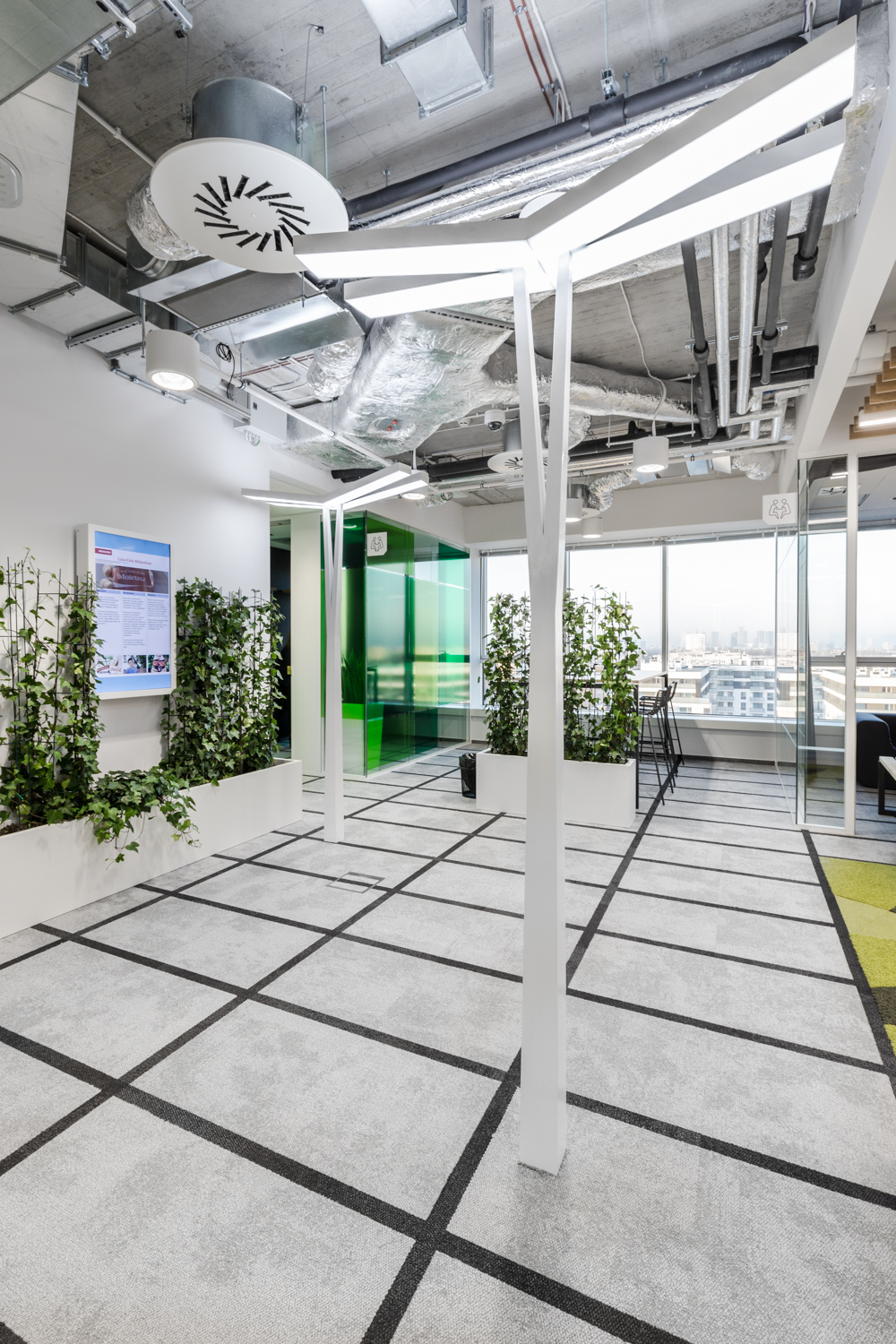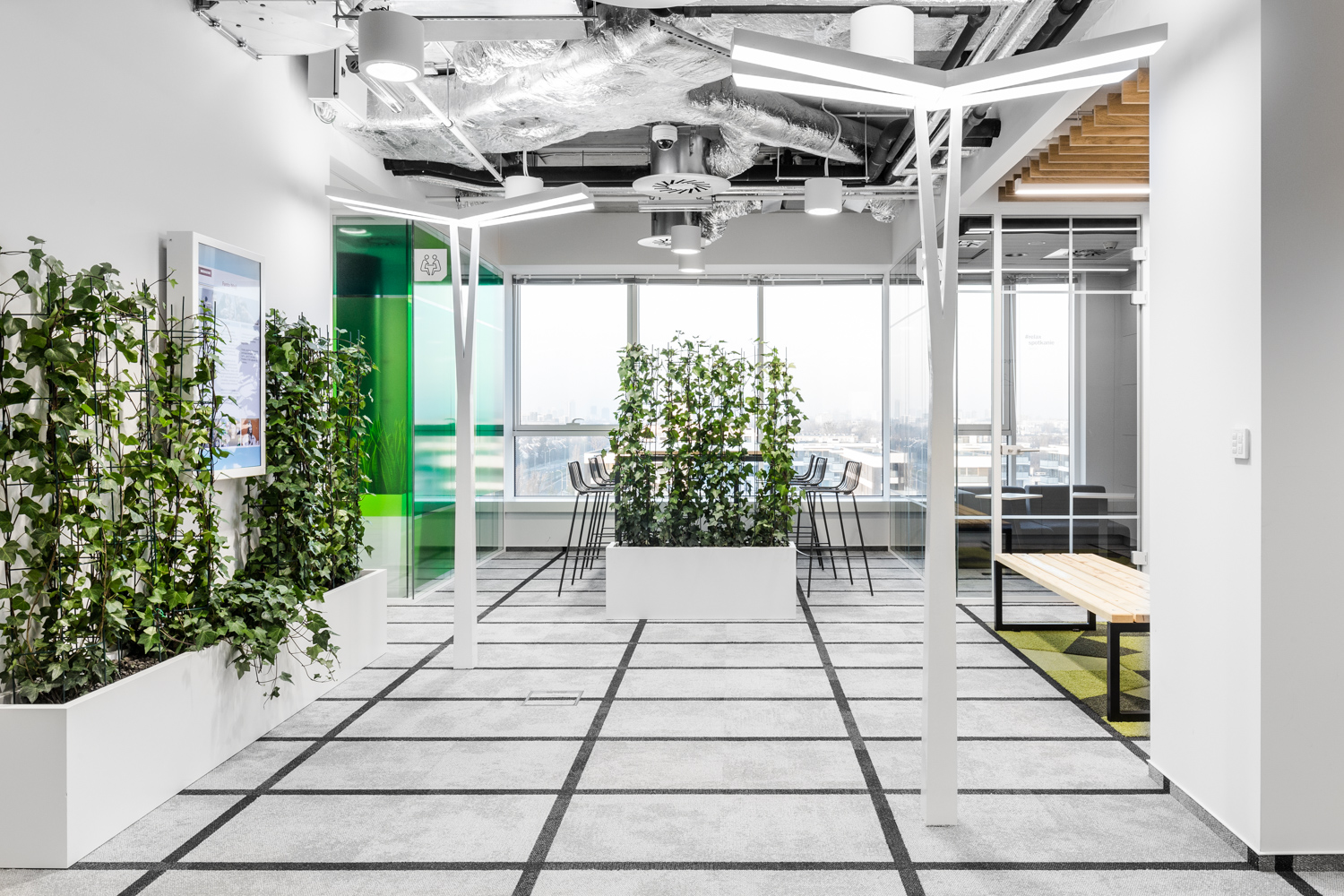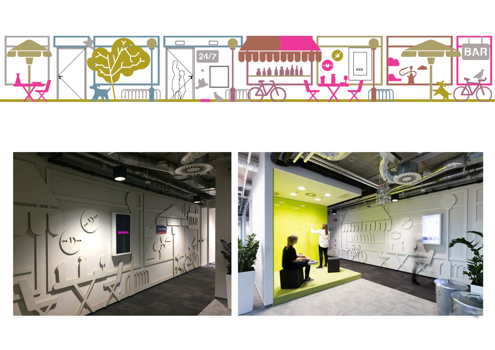 Sama estetyka biura MediaCom – odwołanie do motywów warszawskich, to też element ułatwiający poruszanie się w przestrzeni biurowej. W powierzchni znajduje się: Plac Zbawiciela – duża przestrzeń networkingową z kuchnią, przestrzenie konferencyjne na dworcu Warszawa Centralna, strefy pracy, tematycznie nawiązujące do Centrum Nauki Kopernik, pasażu Wiecha, Biblioteki Uniwersyteckiej, czy Soho Factory oraz strefę pracy projektowej estetycznie nawiązującą do Stadionu Narodowego.
