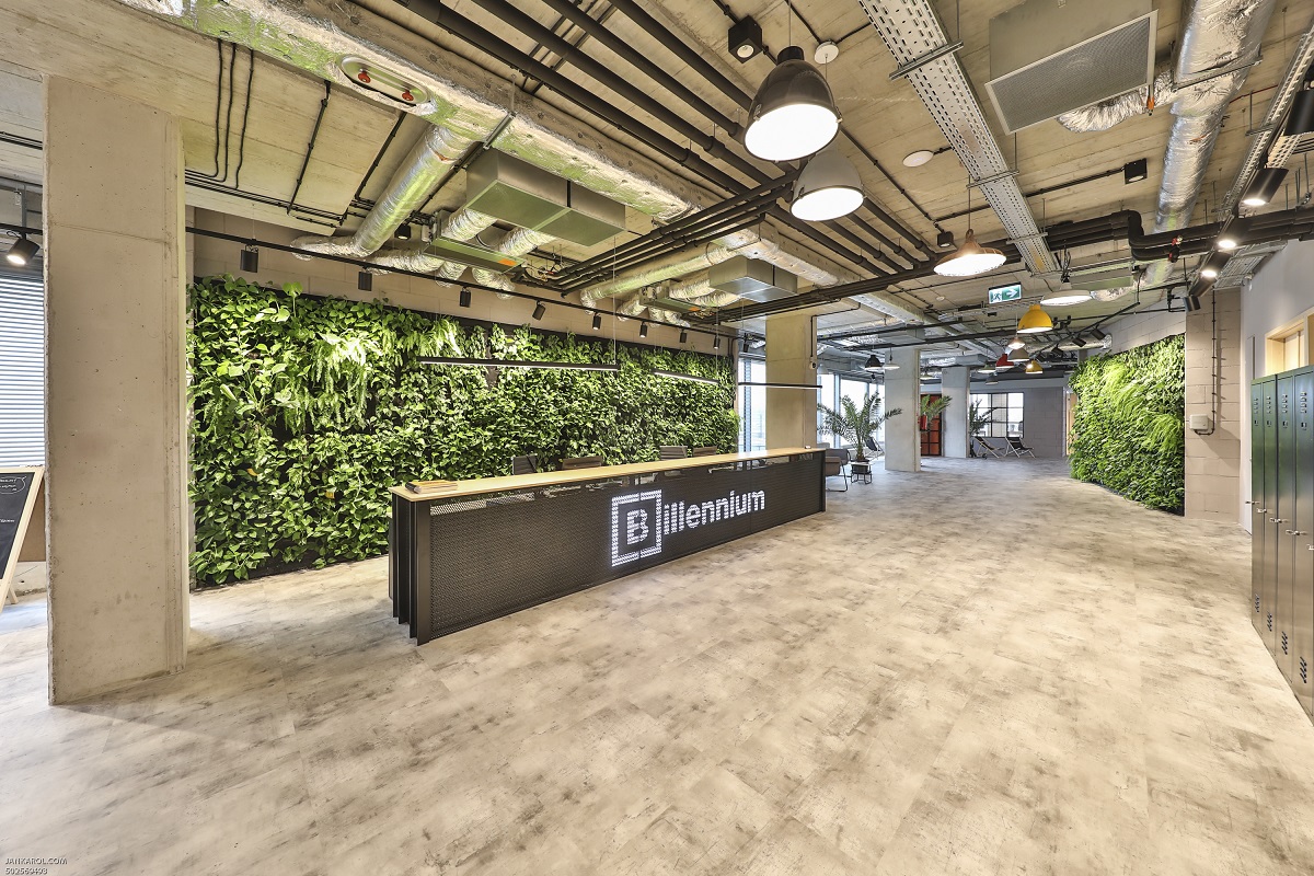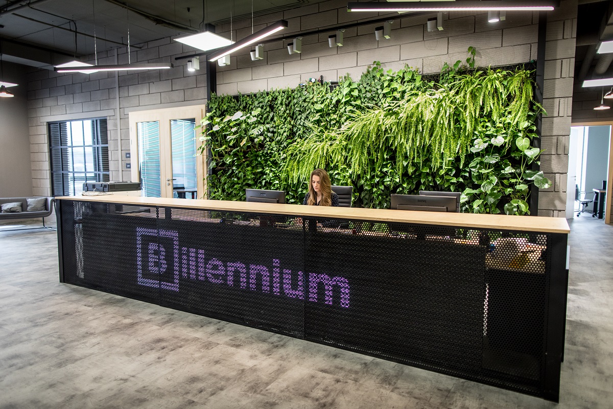 Biura Billennium to biura nowej generacji tzw. biura 4.0 nastawione na innowacje, czyli biura, które zaskakują nietypowymi rozwiązaniami. Wchodzących do recepcji wita ściana z roślinami – jedna z kilku. To nie tylko dekoracja, ale przede wszystkim dawka tlenu dla pracowników. I chociaż jest klimatyzacja, zależało nam, by dopilnować tego, by otwierały się też okna, co wcale nie jest standardem w tego typu biurowcach. Na korytarzach stoją zaparkowane hulajnogi, którymi można przemieszczać się pomiędzy poszczególnymi pokojami, pracować możemy, siedząc na krześle bądź bujając się na hamaku.