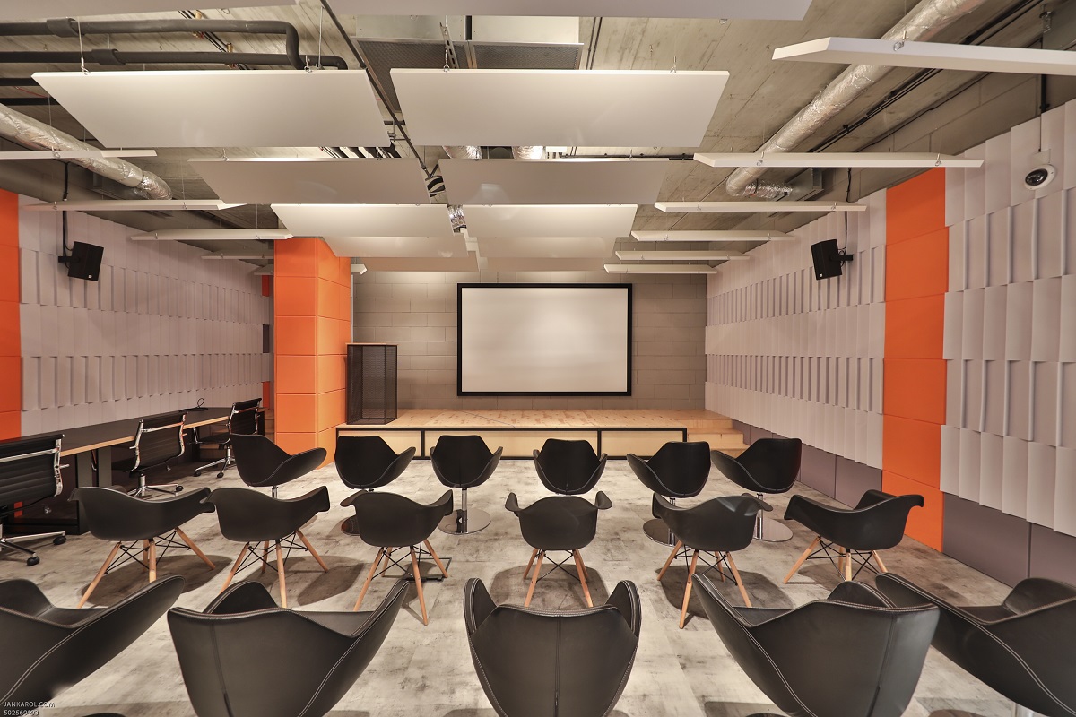 Istotna jest dla nas także przestrzeń konferencyjna. Przestrzeń, która oferuje wiele różnych miejsc do spotkań. Począwszy od najmniejszych salek na krótkie spotkania typu „face 2 face”, a kończąc na salach, w których zapadają strategiczne decyzje, co wymusza ich specyficzny, bardziej formalny wystrój. W tej kwestii w Billennium najchętniej chwalimy się naszym kinem, które służy nam do organizacji konferencji, śniadań tematycznych, prezentacji dla klienta, ale także projekcji filmów dla dzieci w Dzień Dziecka, czy wspólnego oglądania slajdów z wakacji. Z chęcią udostępniamy je także ciekawym inicjatywom z zewnątrz, to u nas odbyły się tegoroczne przesłuchania do TEDx Warsaw!