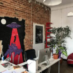 W innej części biura znajdują się rysunki Urszuli, naszej projektantki, które łączą elementy ścienne (źle skuty tynk) z indywidualną, dynamiczną kreską. Naokoło tego wszystkiego jest trochę dzieł z Polskiej Szkoły Plakatu, ale głównie młodych artystów.