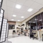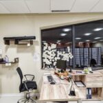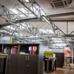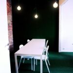 Nad całością góruje oryginalna, metalowa konstrukcja stropu oraz okna dachowe – zespół przez większą część roku może pracować przy świetle naturalnym. A zawieszone na metalowych belkach masywne lampy – to oryginalne lampy fabryczne, które odnalezione zostały na… pobliskim złomowisku.