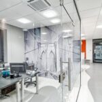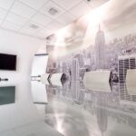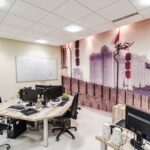 Dzięki przeszklonym ścianom pomieszczenie działu handlowego zyskało na przestrzeni. Jedna ze ścian pomalowana została na czerwono, a w jej centralnym punkcie umieściliśmy kontur mapy świata, który regularnie nowymi realizacjami zapełnia dział zagraniczny Positive Power. Całe pomieszczenie urządzone zostało w spokojnych kolorach z czerwonymi, energetyzującymi akcentami.