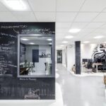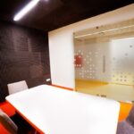 Dla działu technicznego stworzyliśmy pomieszczenie w stonowanych barwach, które sprzyjają pracy w skupieniu i ciszy. Jedna ze ścian pomalowana została na czarno i zagospodarowana w charakterze zmywalnej tablicy. Przestrzeń ta jest wykorzystywana do wizualizacji omawianych projektów lub planowania pracy, co nadaje jej praktyczny wymiar. Często także wykorzystywana zostaje także przez dział kreatywny.