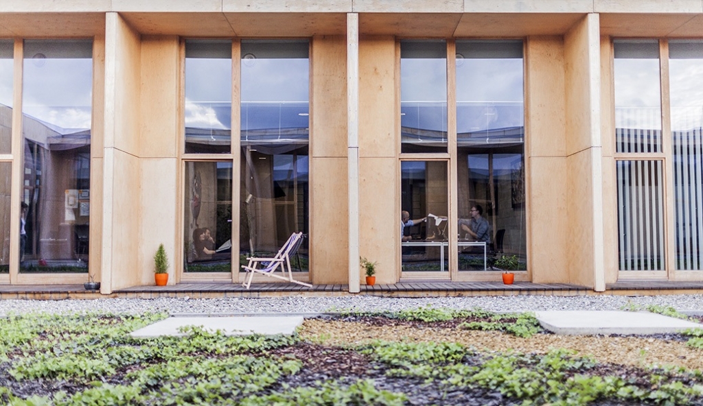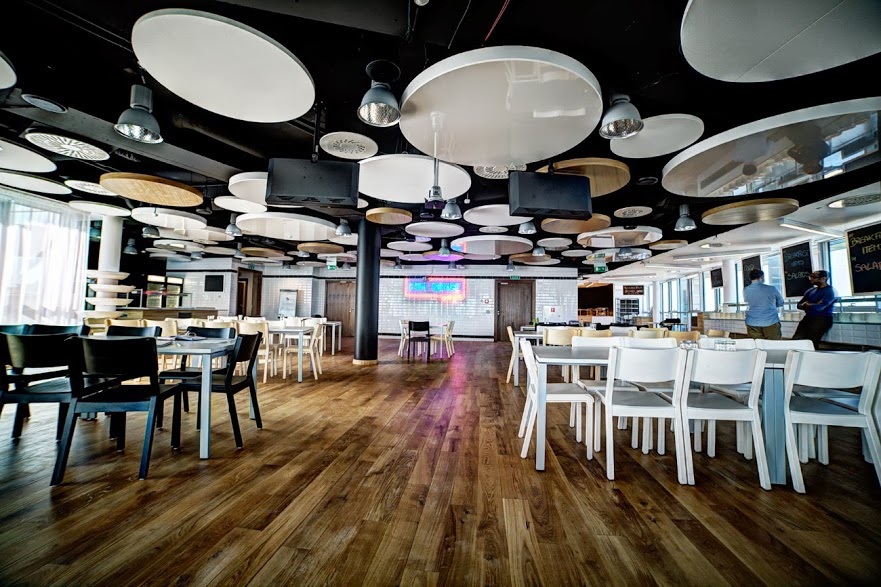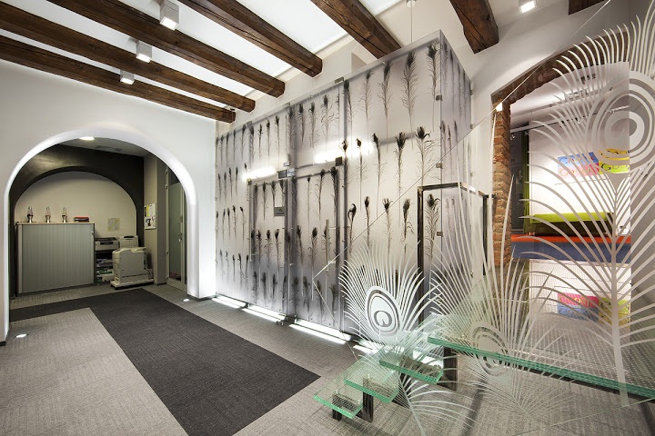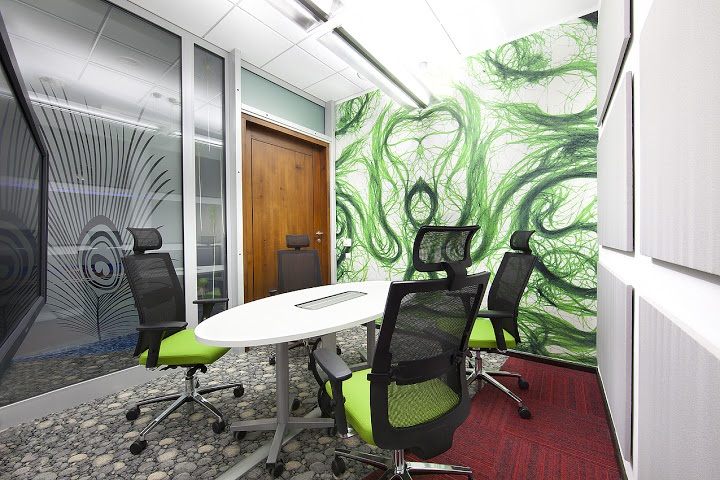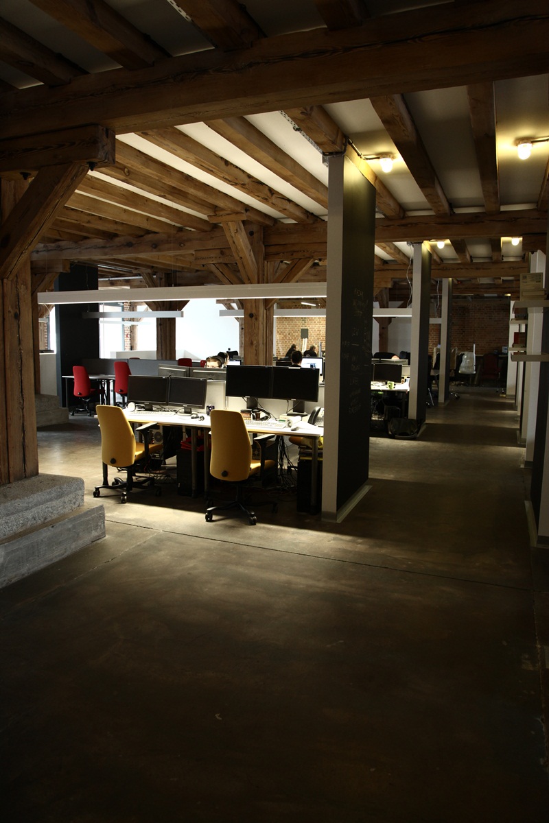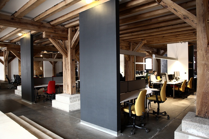 Ściany są szare, ale dzięki wielkim przeszkleniom, połączeniom drewna z betonem i ogromnej ilości świetlików, które rozjaśniają całą przestrzeń – jest nowocześnie, ale miło. Dodatkowo świetliki są tak rozmieszczone, że o każdej porze dnia tworzą na ścianach grę światła i sprawiają, że biuro najciekawiej wygląda podczas zachodów słońca.