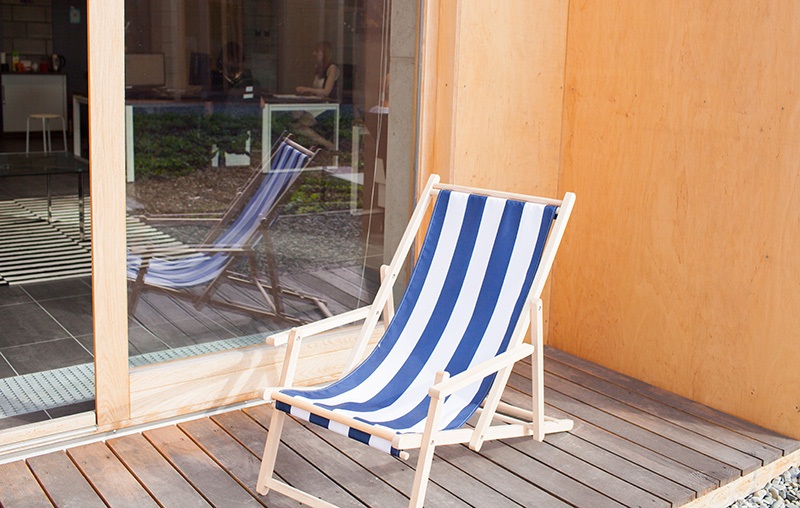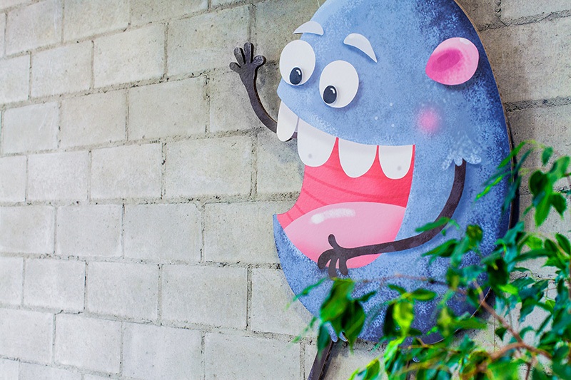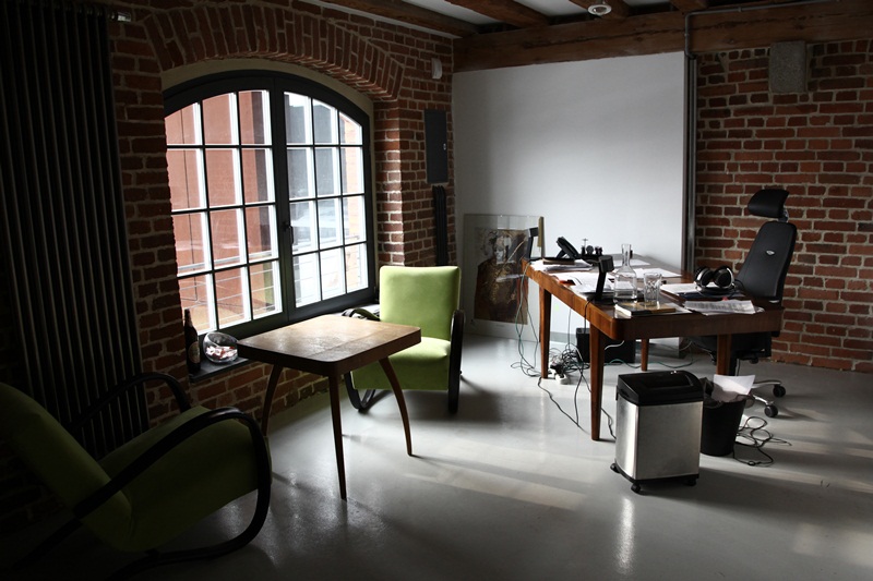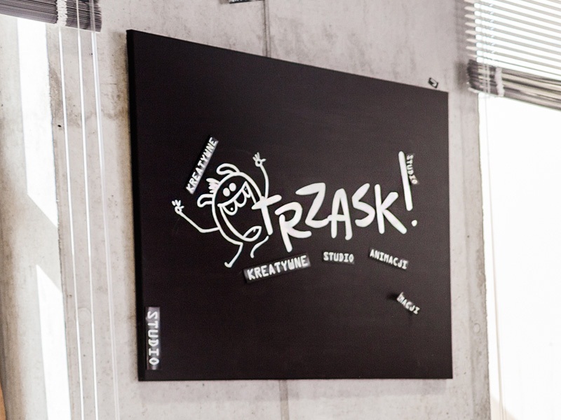 Patio przed biurami urządzone jest w stylu japońskim, z wielką ilością drobnych kamieni, z których często układamy szalone wzory. Wokół zieleń, ale grilla niestety robić tam nie można… A Trzask? Towarzyszył nam od zawsze. Jego dwa wielkie wykroje z wysokogatunkowej tektury zdobią betonowe ściany studia. Dołożyliśmy starań, aby w pełni pozytywnie wpływał na naszą pracę, dlatego zainstalowaliśmy w nim magnetyczne gałki oczne, które przekręcamy w zależności od naszego humoru – to taki znak dla odwiedzających.
