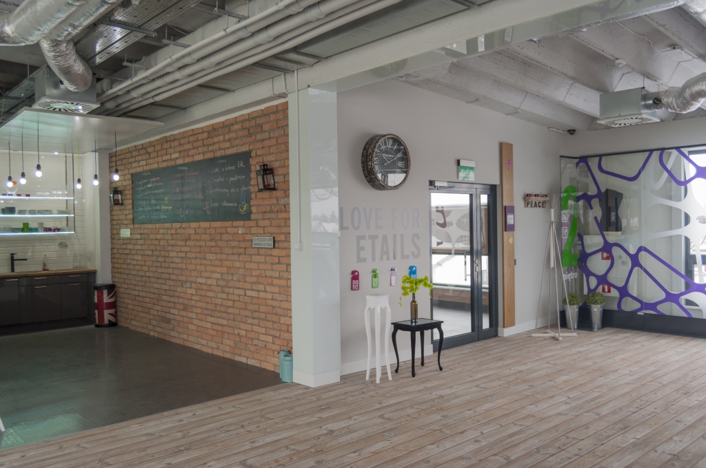 Przy wejściu wykorzystany został jeden z międzynarodowych motywów Sociomantic – pozdrowienia z krajów gdzie firma ma swoje biura. Dla zachowania równowagi między pracą a relaksem zaprojektowano playroom wyposażony w stół do piłkarzyków, worek bokserski oraz wygodne pufy. Dzięki temu każdy członek zespołu może pracować w takim stylu, trybie i miejscu jakie mu najbardziej odpowiada.