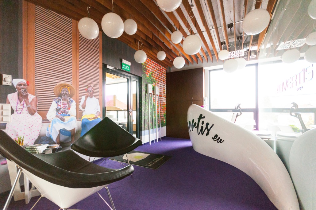 Przybyłych gości wita niebanalna lada recepcyjna wykonana z żywicy przy wykorzystaniu technologii przy budowania jachtów i desek windsurfingowych. Paweł Gardasiewicz – prezes Grupy Advertis jest olimpijczykiem z Atlanty, aktualnym mistrzem Europy w klasie Raceboard oraz mistrzem świata Masters z 2013 roku.