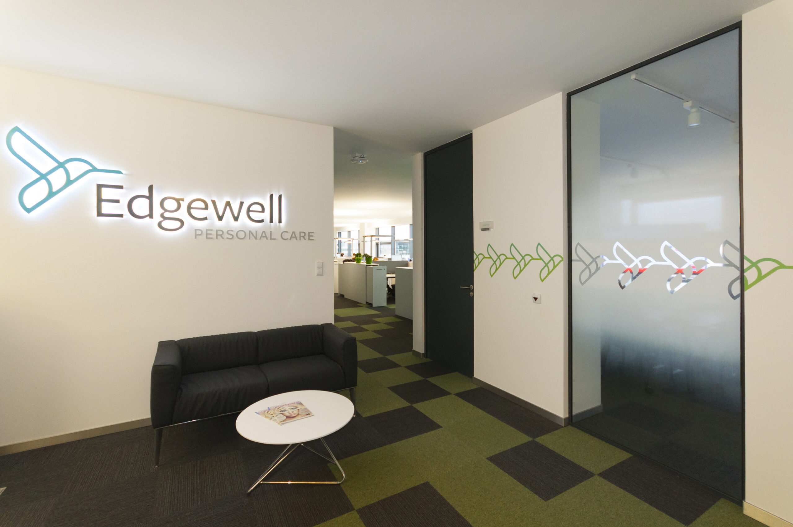 Za aranżację wnętrz siedziby spółki Edgewell Personal Care w biurowcu przy ulicy Domaniewskiej 45 odpowiedzialna jest firma CBRE, system oznaczeń wykonała Grupa Advertis.