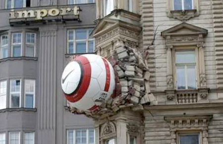 Jedną z reklam, która najbardziej zwróciła naszą uwagę swoim wyglądem i kreatywnym zamieszczeniem jest piłka Nike’a. Nie jest to jednak zwykła piłka, tylko ogromny obiekt wbity efektownie w budynek, a wokół niego kawałki zniszczonej od uderzenia ściany. I jak tu jej nie zauważyć?