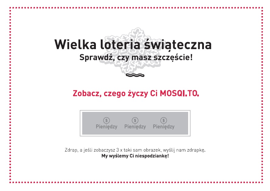 Zorganizowaliśmy naszym klientom i kilku zaprzyjaźnionym redakcjom świąteczną zdrapkę – można było wylosować pieniądze, zdrowie lub spokój. Wybrańcy losu otrzymywali kurierem dolary, calmsy lub procenty zamknięte w malej buteleczce. Oby do Świąt!