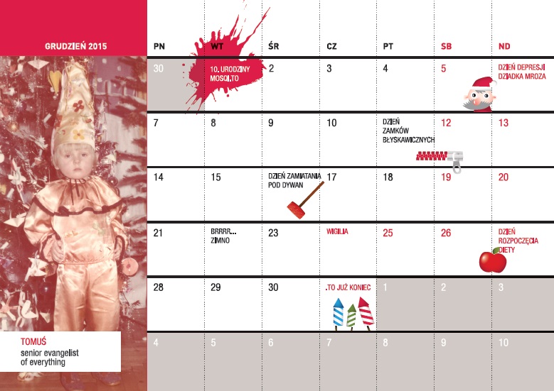 Tradycyjny kalendarz na 2015 rok był kalendarzem wyjątkowym. Odarliśmy się wówczas z prywatności i zdradziliśmy swe oblicza z czasów, kiedy nikt nie myślał o deadline’ach, ASAPie i popraweczkach. Jak choćby Tomek Soluch, Creative Director, a tak naprawdę krasnoludek w stroju z epoki.