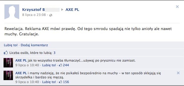 W innym duchu zachował się Axe. Znów żadnego kryzysu nie było, był nieprzychylny i dość prymitywny komentarz anonimowego fana. Axe mógł nie reagować w ogóle, mógł – korzystając z powszechnej, grzecznościowej maniery – uroczystym tonem napisać coś w stylu „zapraszamy, polecamy, dziękujemy za opinię, szkoda, miło, pozdrawiamy itp.”, zamiast tego zachował się niekonwencjonalnie – spacyfikował (średnim, ale jednak) humorem pana, który rzucił kamieniem. Oczywiście, branża jest podzielona, czy było to tip top, jednak reakcja fanów Axe, a także ich nagły przyrost, jak i charakter samego produktu, do którego taka konwencja, włącznie z językiem pasuje – mówią same za siebie gdzie branżowe tip top ma przeciętny odbiorca komunikacji Axe.