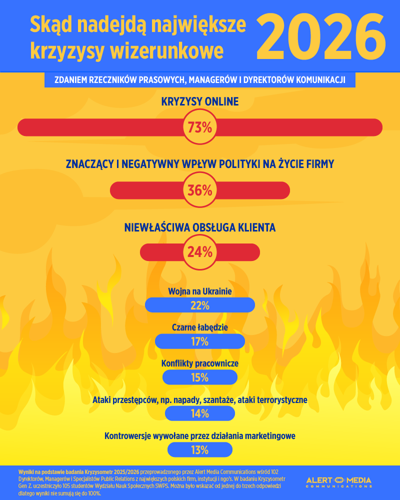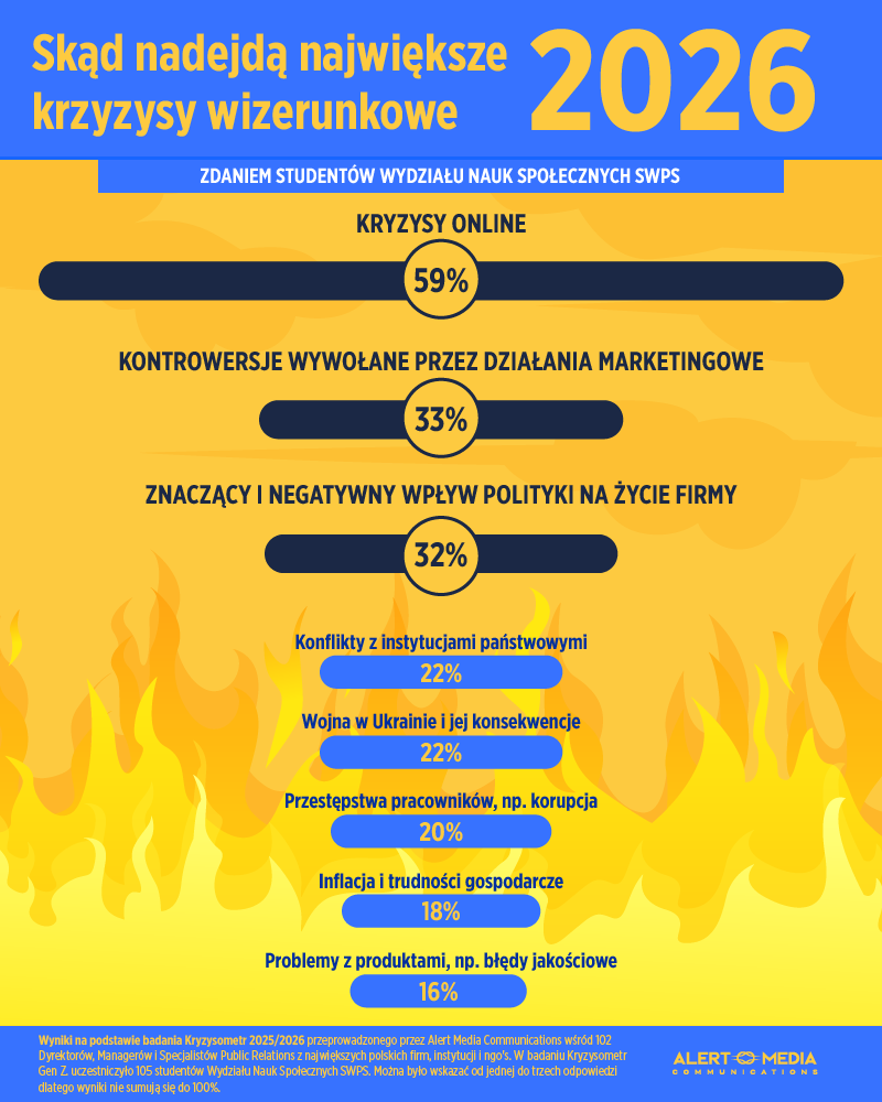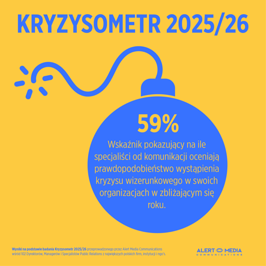 Wskaźnik Kryzysometru, tworzony corocznie przez Alert Media Communications na podstawie opinii ponad 100 dyrektorów komunikacji, managerów i rzeczników prasowych, w 2025 roku wyniósł 59%. To wzrost o 3 punkty procentowe rok do roku i drugi najwyższy wynik w historii badania – zaraz po rekordowym 2021 roku (60%).