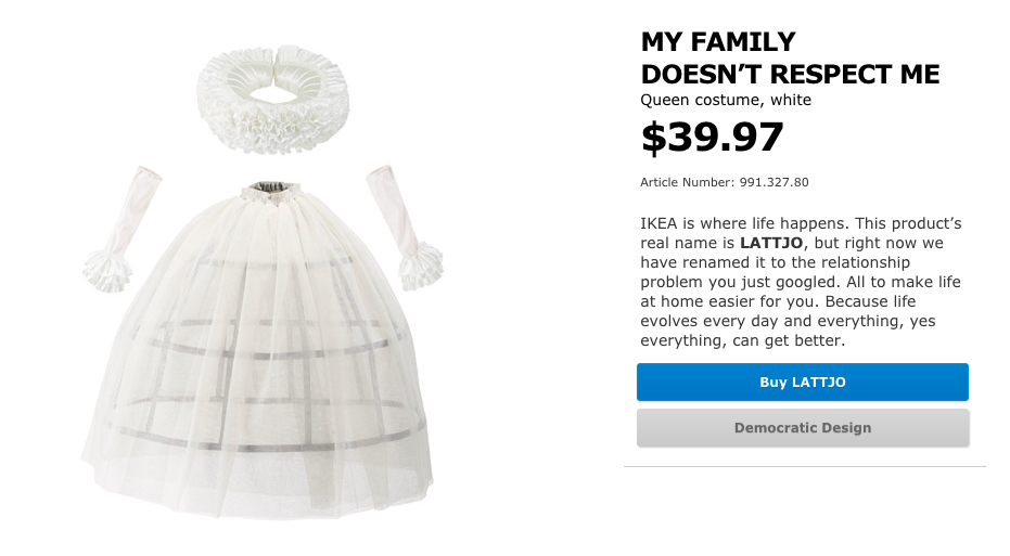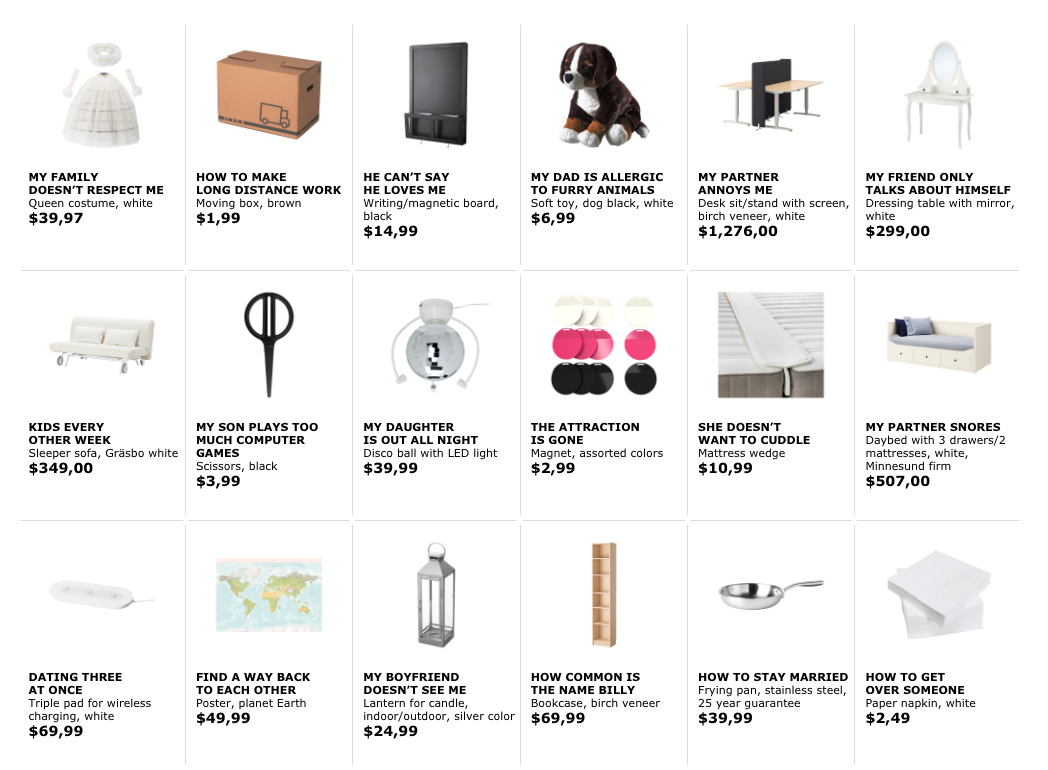 Jest to perfekcyjnie bezczelna gra SEO, która jednak odnosi się do problemów w relacjach, które produkt Ikea może “za nas” rozwiązać. Sprawdźcie: