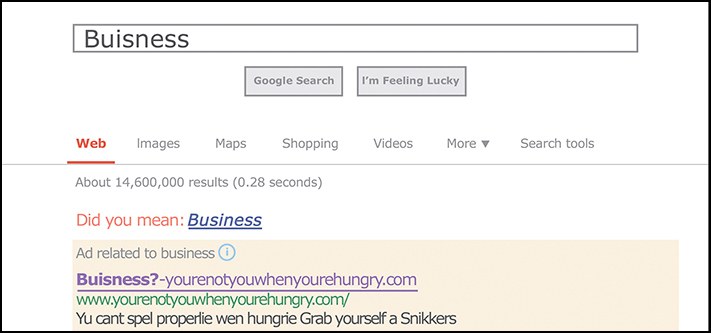 Snickers dotarł masowo do odbiorców poprzez akcję „Snickers Google Misspellings”. Polegała ona na dotarciu w AdWords do tych użytkowników, którzy źle wpisali wyszukiwaną frazę, popełniając przy tym literówki. Reklama sugerowała poprawną pisownię, przypominając, że „będąc głodnym nie jesteś sobą”. Użycie setek słów i warunków było nie lada wyzwaniem, ale finalny efekt końcowy był tego wart. Kampania podczas pierwszych dwóch dni dotarła do ponad 500 000 użytkowników.