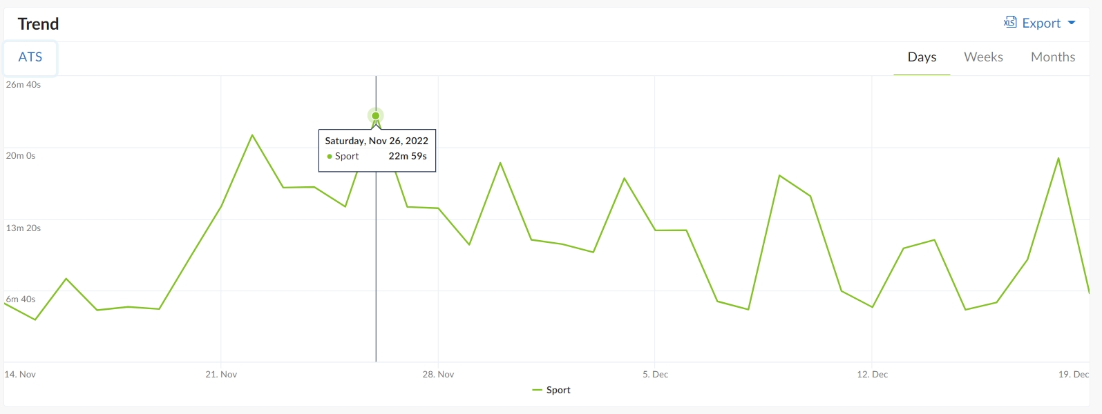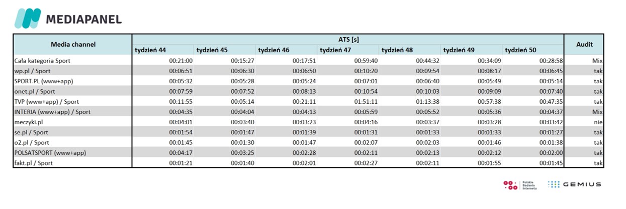 Analiza ATS (average time spent) w omawianym okresie potwierdza zjawisko szczególnego zainteresowania meczami biało-czerwonych. Tym razem najwyższy wynik odnotowano w tygodniu 47 (21-27 listopada), a więc na początku fazy grupowej, gdy polska reprezentacja rozgrywała spotkania z Meksykiem i Arabią Saudyjską. Wskaźnik ten wyniósł wówczas dla całej kategorii niemal godzinę (59 min i 40 sek). Najniższy jest natomiast – podobnie jak w przypadku RU – w ostatnim tygodniu mundialu. Średni czas spędzony na stronach i aplikacjach sportowych wyniósł wówczas niecałe pół godziny (28 min i 58 sek.).