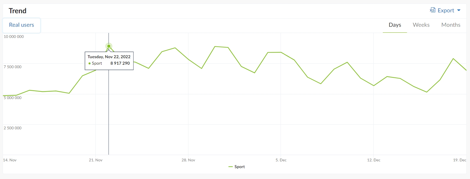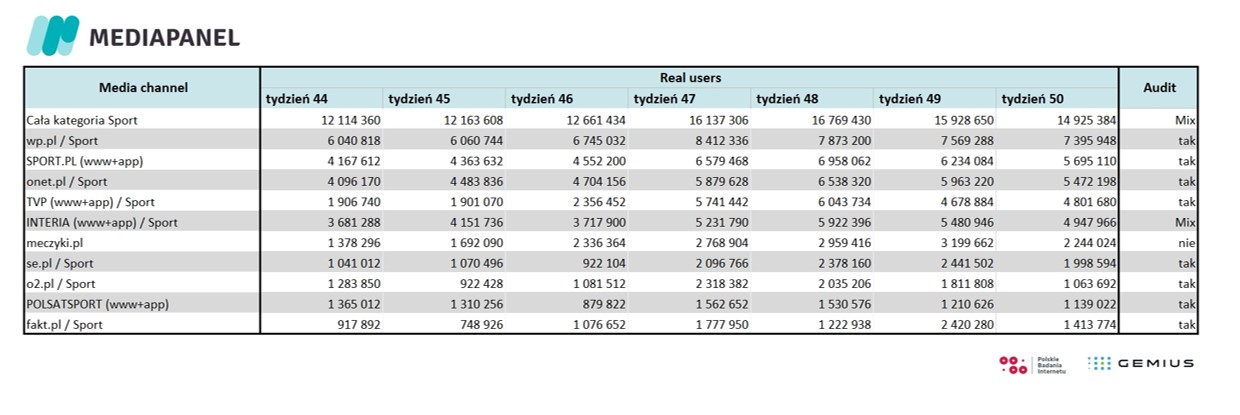 Jeśli chodzi o liczbę użytkowników, którzy strony i aplikacje z kategorii „Sport” przeglądali w konkretne dni, najwyższy wynik odnotowano 22 listopada, a więc gdy Polacy rozgrywali swoje pierwsze mundialowe spotkanie, z Meksykiem. Wskaźnik RU wyniósł wówczas 8,9 mln. 18 grudnia, w dniu finału Mistrzostw Świata, treści o tematyce sportowej w internecie przeglądało 7,9 mln osób.