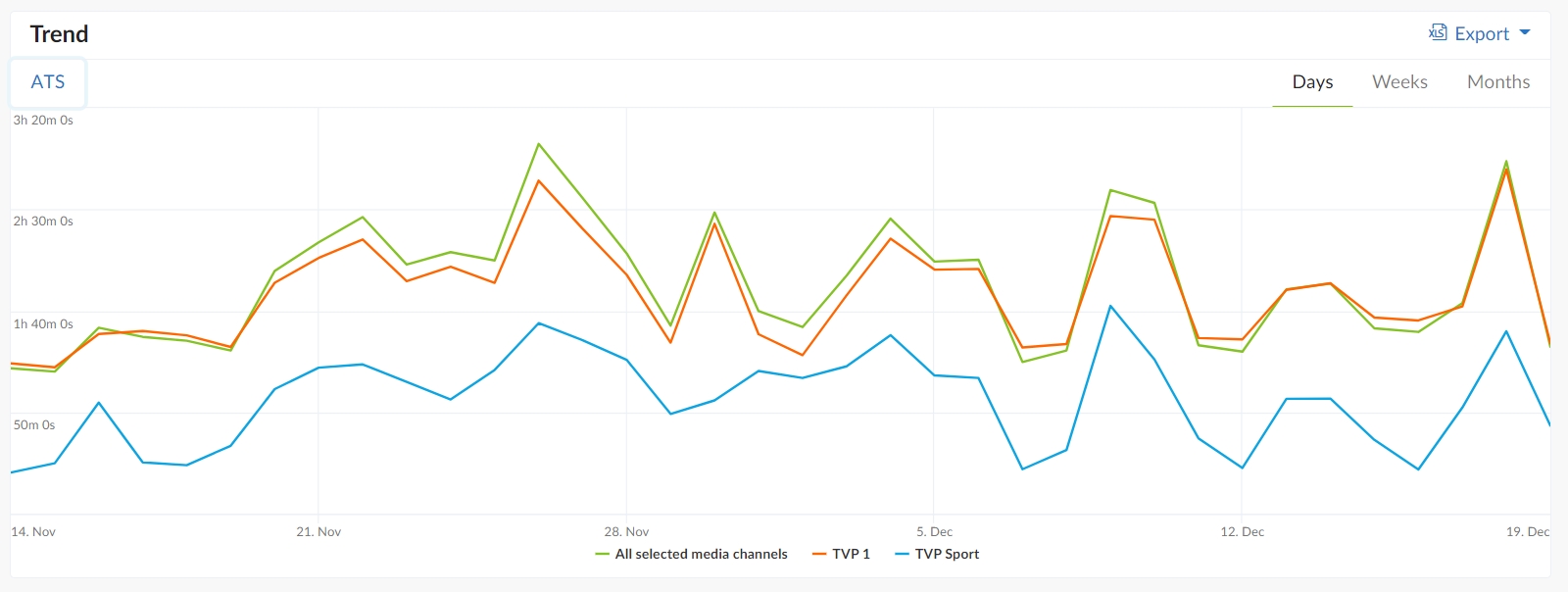 Najwyższy wskaźnik ATS dla analizowanych kanałów odnotowano 26 listopada, kiedy to wyniósł on 3 godz. 2 min i 18 sek. Drugim w kolejności dniem z najdłuższym średnim czasem spędzonym na TVP1 i TVP Sport był 18 grudnia, a więc dzień zakończenia mistrzostw (2 godz. 53 min i 45 sek.).