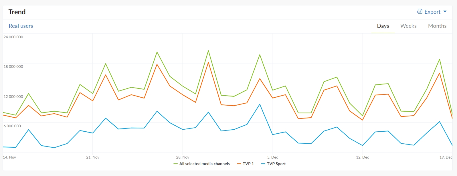 Sprawdzono też liczbę realnych użytkowników, którzy w okresie mundialu oglądali TVP 1 oraz TVP Sport, czyli kanały, na których transmitowane były turniejowe mecze. Dla uproszczenia wyłączono z analizy TVP2, na którym to kanale transmisje zakończyły się wraz z fazą grupową. Największą liczbę widzów na obu analizowanych antenach łącznie odnotowano kolejno 30 listopada (mecz Polska-Argentyna, 20,5 mln RU), 26 listopada (mecz Polska–Arabia Saudyjska, 20,3 mln RU) oraz 4 grudnia (mecz Polska–Francja, 19,7 mln RU). W dniu finału TVP1 i TVP Sport zgromadziły łącznie 18,8 mln RU.