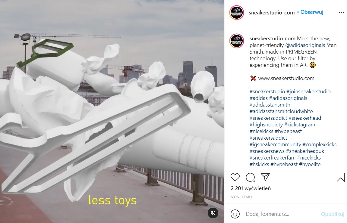 Razem z nowo powstałym warszawskim salonem sklepu SneakerStudio adidas postanowił przenieść swój manifest o zredukowaniu zużycia plastiku do świata rzeczywistości rozszerzonej. Na potrzeby kampanii powstał instagramowy filtr AR, dzięki któremu można zobaczyć ten kultowy model w niecodziennej odsłonie. Już na początku maja w stolicy pojawią się citylighty, które za pomocą smartfona pokażą przechodniom niezwykłą ekspozycję z wirtualnych plastikowych odpadów, które pod odpowiednią perspektywą ułożą się w sylwetkę legendarnego buta Stan Smith.
