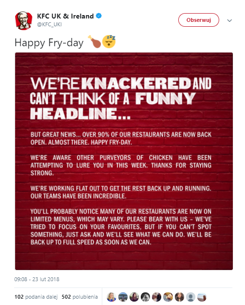 Po tym, jak na prawie każdym lokalu widniała kartka „dziś nieczynne”, marka zamieściła przeprosiny w dziennikach „The Sun” i „Metro”. Na grafice widniał pusty kubełek i okruszki w tle. Litery składające się na nazwę firmy zostały zmienione w charakterystyczny sposób 😉