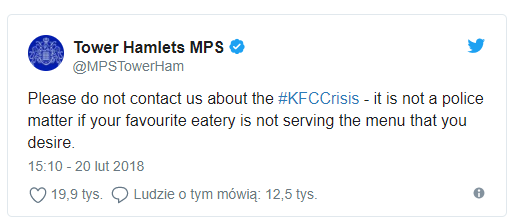 W ubiegłym tygodniu ponad 562 restauracji KFC w Wielkiej Brytanii były zamknięte po tym, jak po zmianie systemu operacyjnego dostaw firma DHL miała „drobne” problemy organizacyjne. W sprawie głos musiała zabrać również policja, ponieważ funkcjonariusze dostawali telefoniczne zgłoszenia w sprawie zamkniętych lokali.