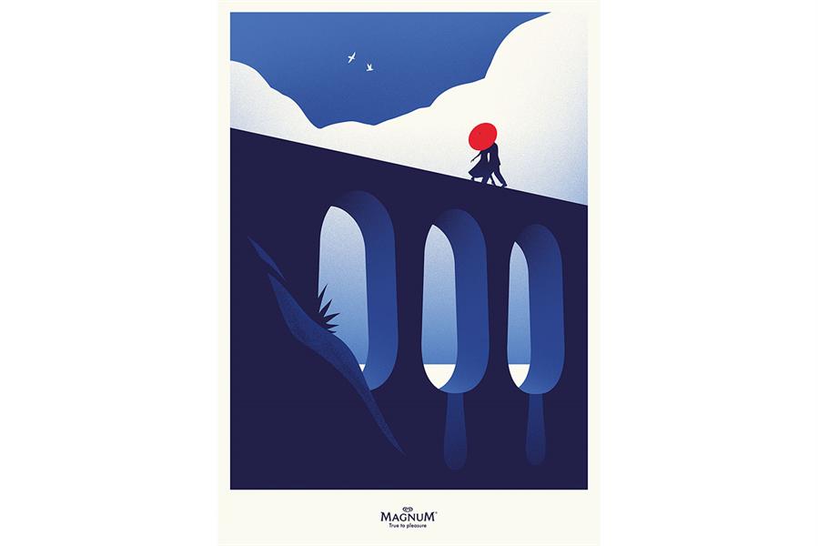 Producent lodów Magnum od lat zaskakuje nas odważnymi i pięknymi kreacjami. W najnowszej kampanii marki kształty lodów są sprytnie zintegrowane z artystycznymi reklamami zewnętrznymi.