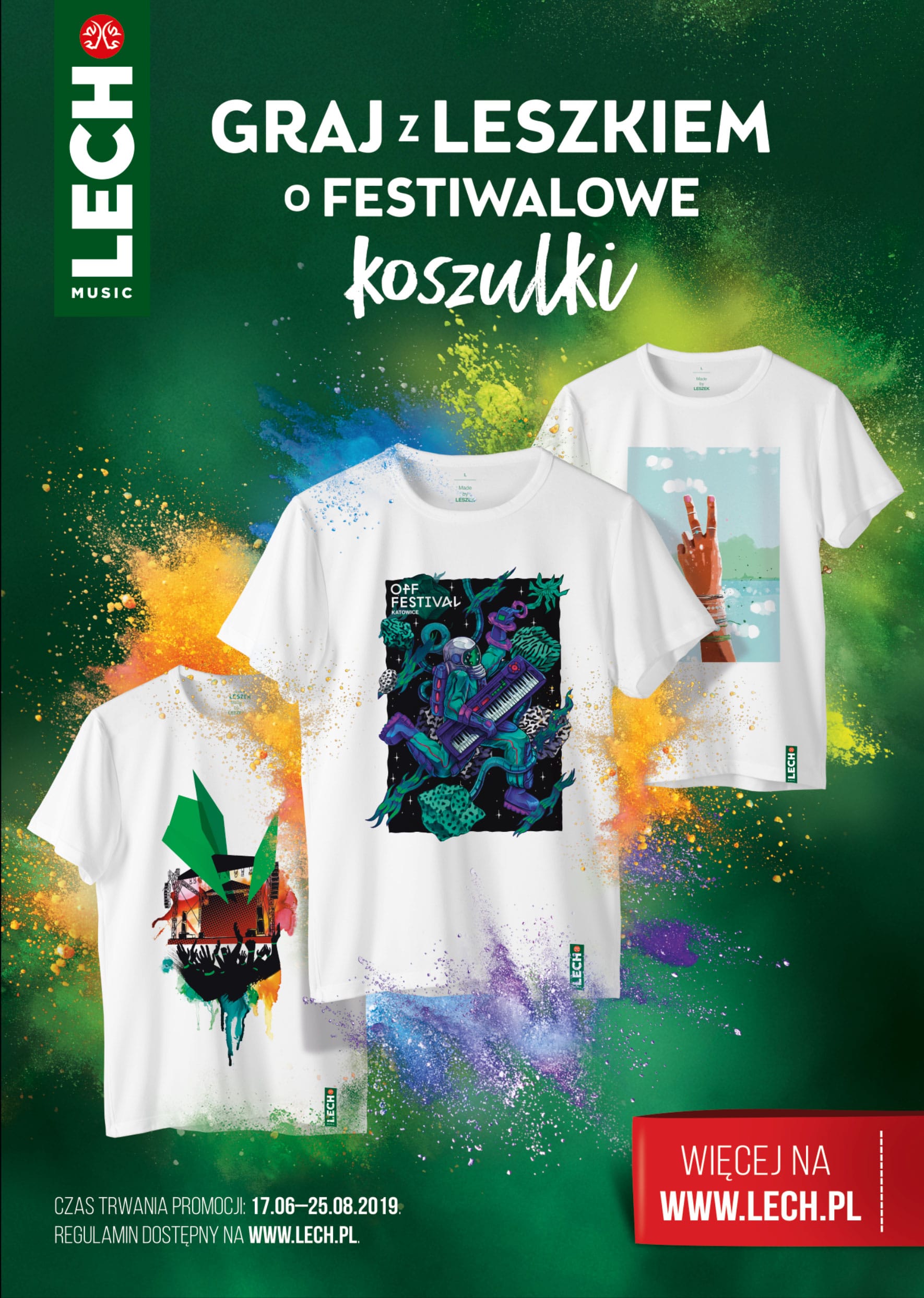 Leszek znany jest ze swojego zamiłowania do zabawy w rytmie najlepszej muzyki. W te wakacje dla wszystkich swoich fanów przygotował dawkę atrakcji, która zaspokoi nawet najbardziej wymagających festiwalowiczów. Osią letniej komunikacji marki jest hasło „z Leszkiem lato zawsze jest pełne muzyki”. Zaplanowane działania spełnią tą obietnicę z nawiązką! Już wystartował cieszący się w ubiegłym roku dużym zainteresowaniem quiz. By wziąć w nim udział, wystarczy kupić LECHA objętego promocją, wpisać kod spod kapsla lub zawleczki w formularzu dostępnym na stronie marki i zmierzyć się pytaniami dotyczącymi muzyki. W każdym tygodniu konkursu 1500 osób, które najlepiej poradzi sobie z quizem, zdobędzie koszulki zaprojektowane przez takich artystów jak Dawid Ryski, Lis Kula czy Miss Pank. Dodatkowo, wśród projektów znajdą się również wzory dedykowane trzem festiwalom, na których spotkamy markę: Audioriver, OFF Festival i Pol’and’Rock. Nie mogło być inaczej: stworzenie motywu koszulki na Najpiękniejszy Festiwal Świata Leszek ponownie powierzył Jerzemu Owsiakowi.