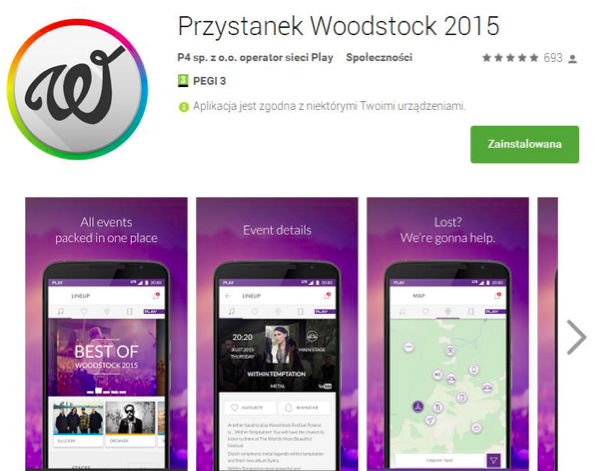 Jednym z dominujących kolorów na Woodstocku był fiolet, a to za sprawą ogromnej ilości gadżetów, które rozdawał Play. Chusty, piankowe maty, tabliczki, torby, flagi… pierwsza jednak była aplikacja.