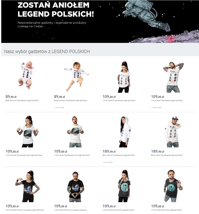 Legendy Polskie to nowatorski projekt, dlatego i tym razem Allegro przygotowało dla fanów cyklu coś wyjątkowego. Na świecie popularny jest trend związany z produkcją filmowych gadżetów. Teraz każdy będzie mógł poczuć się jak Twardowsky w jednej z limitowanych wersji koszulek z grafikami nawiązującymi do filmu. Wśród produktów sygnowanych marką Legendy Polskie Allegro, które można znaleźć na allegro.pl/legendy, znalazły się także kubki, bluzy, dziecięce body przypominające skafander astronauty, czapki, naszywki czy pinsy. To nie wszystko. Jeśli ktoś marzył o roli w filmie, udziale w premierze i spotkaniu z twórcami bądź wizycie na planie, będzie mógł te marzenia zrealizować. Dochód ze sprzedaży zasili budżet produkcji, a każdy kupujący stanie się Aniołem Legend Polskich.