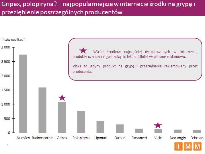 Każdy producent ma jeden środek, który popularnością przewyższa pozostałe pozycje z oferty. Co ciekawe, popularność w internecie niekoniecznie jest związana z wydatkami reklamowymi firmy. Najczęściej pojawiającym się w dyskusjach internautów środkiem jest Nurofen, ale… Popularność na forach i blogach często wiąże się z dość nieprecyzyjnym nazywaniem leków, dlatego, choć do analizy wydatków reklamowych przyjęto Nurofen jedynie ukierunkowany na grypę i przeziębienie, w wynikach popularności w internecie może się pojawić także inny Nurofen, jako środek przeciwbólowy, lecz w kontekście grypowym – zauważa Nina Olszewska z Instytutu Monitorowania Mediów. Nie mniej jednak, z analizy wydatków producenta tego środka wynika, że Nurofen nie jest najbardziej doinwestowaną perłą w koronie. Reckitt Benckiser znacznie bardziej dla o popularność pastylek Strepsils, które nie są szczególnie popularne w internecie.