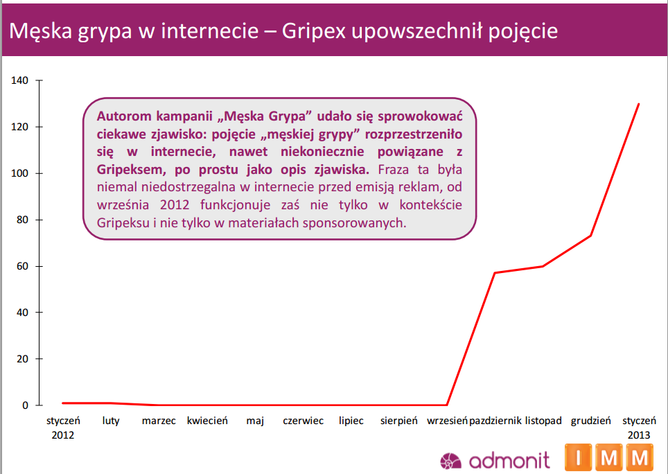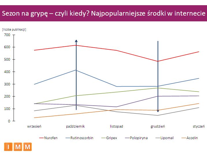 Instytut Monitorowania Mediów przeanalizował w ramach admonit (monitoring wydatków reklamowych) przekazy na temat leków na grypę i przeziębienie. Raport zawiera dane dotyczące zarówno działalności reklamowej producentów tych środków (prezentuje ich wydatki reklamowe związane z emisją reklam w prasie, radiu i telewizji), jak i niekomercyjnej obecności tych zagadnień w mediach – w niesponsorowanych artykułach internetowych oraz wypowiedziach użytkowników mediów społecznościowych – zbadanych w ramach projektu Kompas Social Media. Wyniki badania skomentowali: prof. dr hab. Dariusz Doliński (Szkoła Wyższa Psychologii Społecznej), dr Jacek Wójcik (Podyplomowe Studia Nowoczesnej Promocji Szkoła Główna Handlowa) oraz Dorota Cudna-Sławińska, (Millward Brown Healthcare Poland). Raport obejmuje okres od 1 września 2012 do 31 stycznia 2013 roku i jest dostępny bezpłatnie.