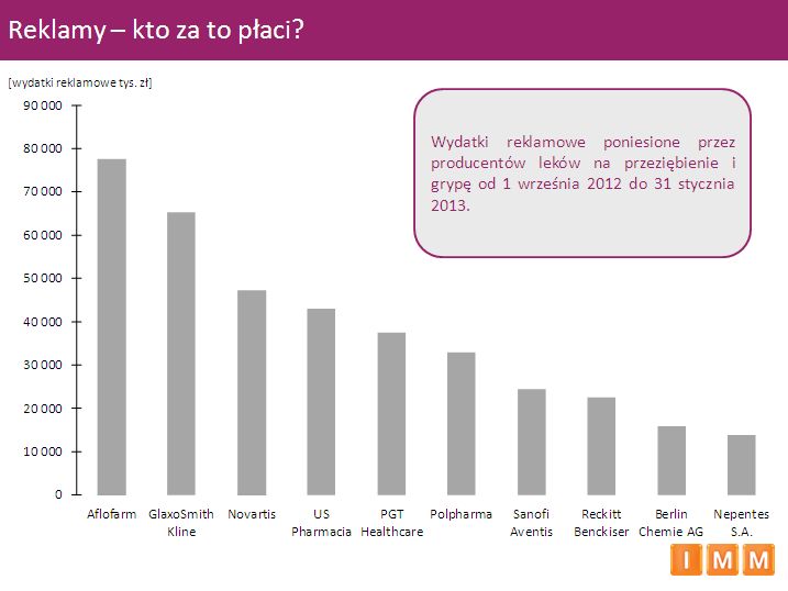 W badanym okresie największe wydatki reklamowe na przekazy dotyczące środków na przeziębienie i grypę, zanotowała firma Aflofarm. Na drugim miejscu jest GlaxoSmith Kline, na trzecim Novartis. Warto odnotować przypadek PGT Healthcare, ponieważ firma ta, stanowiąca spółkę joint venture Teva Pharmacuticals i Procter&Gamble, ma w portfolio tylko jeden środek z badanej kategorii – Vicks.