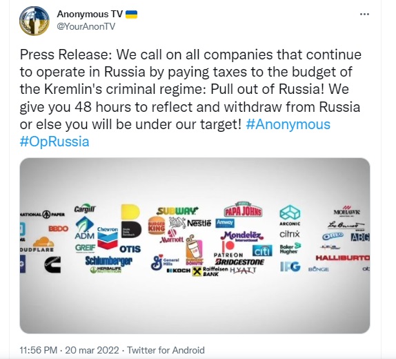 Anonymous wzywa zachodnie spółki do wycofania się z Rosji i daje im na to czas do południa 22 marca.
