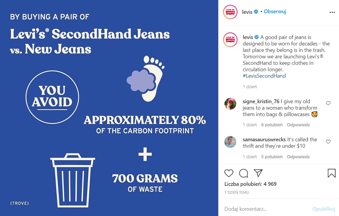 Przykładem tego jest najnowsza inicjatywa marki Levi’s, która to ruszyła z własnym second handem. W ramach programu każdy klient będzie mógł oddać swoje stare jeansy oraz inne ubrania, a w zamian otrzyma kartę podarunkową. Co prawda kartę wykorzystać będzie można na zakup nowych ubrań marki, lecz po jakimś czasie będziemy mogli je ponownie firmie „odsprzedać”. Ważne bowiem, aby były one stale w obiegu, a nie zostały wyrzucone na śmietnik.