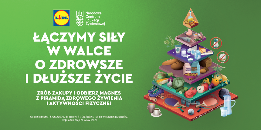 Lidl Polska razem z Narodowym Centrum Edukacji Żywieniowej podjęli współpracę, której celem jest uświadamianie Polaków w kwestii zdrowego i świadomego odżywiania. Sieć sklepów wraz z NCEŻ rozpoczęły właśnie kampanię, której tematem przewodnim jest redukcja soli i cukru w codziennej diecie. Firmie Lidl Polska zależy na tym, aby każdy klient znał nową piramidę żywienia i stosował jej zasady w codziennym życiu, dlatego od poniedziałku, 5 sierpnia, w sklepach Lidl przy zakupach za m.in. 60 złotych, zawierających co najmniej jedno warzywo lub owoc, klienci otrzymają magnes z nową Piramidą Zdrowego Żywienia i Aktywności Fizycznej. Zamieszczony w widocznym miejscu magnes – np. na lodówce – może wywołać wśród domowników rozmowy na temat stylu odżywiania, kupowanych produktów oraz zachęcić do wprowadzania zmian w codziennym jadłospisie.