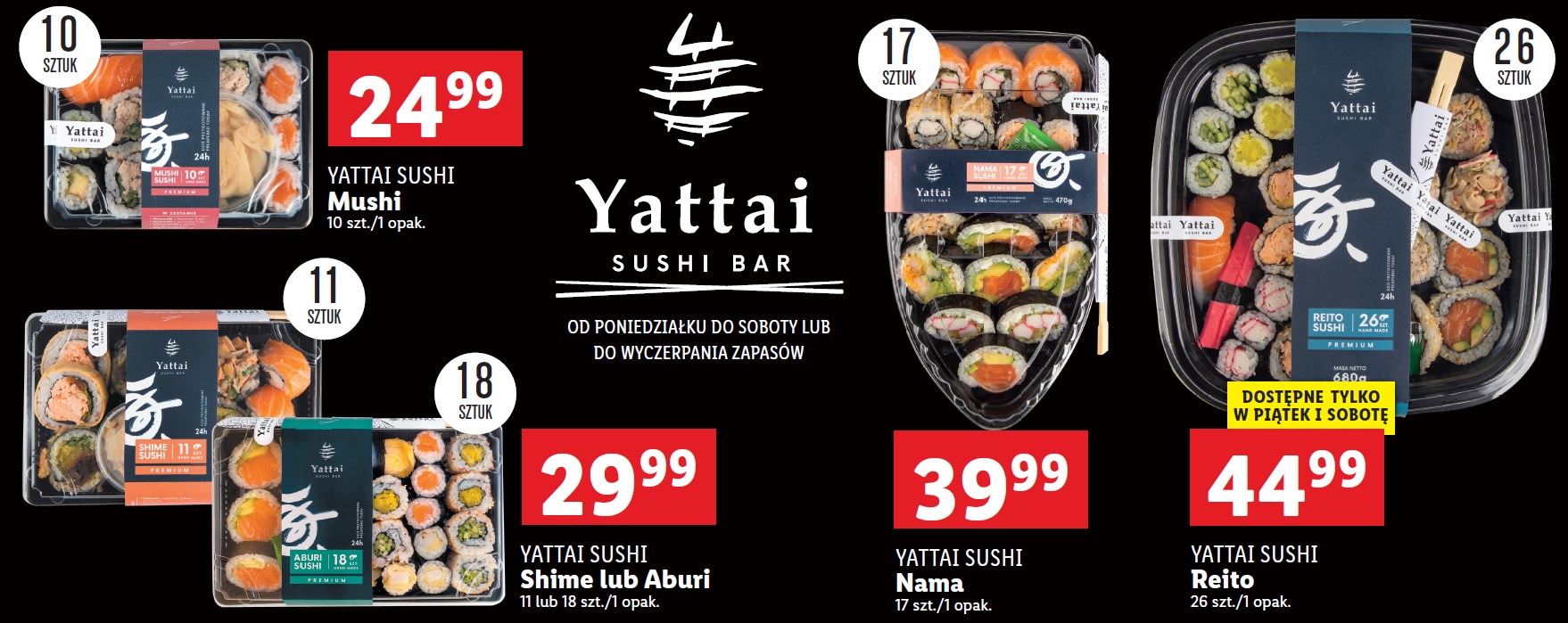 Świeże zestawy sushi przygotowywane są przez restaurację Yattai, której właściciel, Marcin Kaczmarek, posiada wieloletnie doświadczenie w przyrządzaniu sushi i może pochwalić się certyfikatami gwarantującymi profesjonalizm i odpowiednie kompetencje m.in.: WSSI (World Sushi Skills Institute) przy współpracy AJSA (All Japan Sushi Association). Zestawy dla Lidla są przygotowywane w nocy i dostarczane do sklepów każdego dnia od poniedziałku do soboty, tak aby zagwarantować najwyższą jakość i świeżość produktów. Lidl zadbał o wysokiej jakości składniki oraz ciekawe kompozycje smakowe. Do wyboru jest pięć różnych zestawów smakowych od 24,99 zł do 44,99 zł, w tym specjalny powiększony zestaw weekendowy dostępny w ofercie w piątki i w soboty.