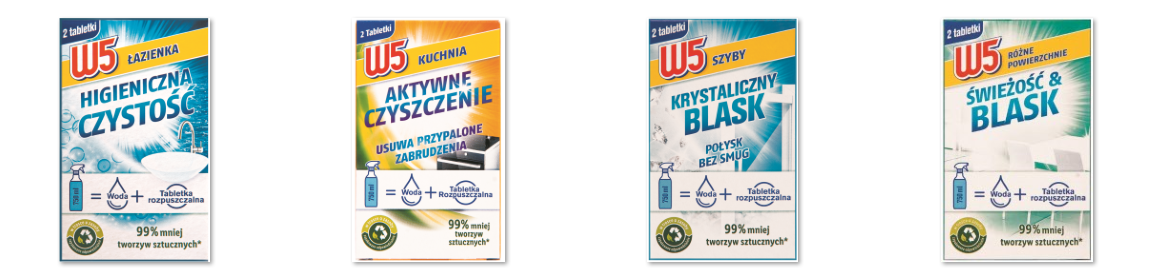 Tabletki W5 Ecoclear dostępne są w 4 wariantach, z przeznaczeniem do sprzątania: kuchni, łazienki, szyb oraz płyn uniwersalny do różnych powierzchni.