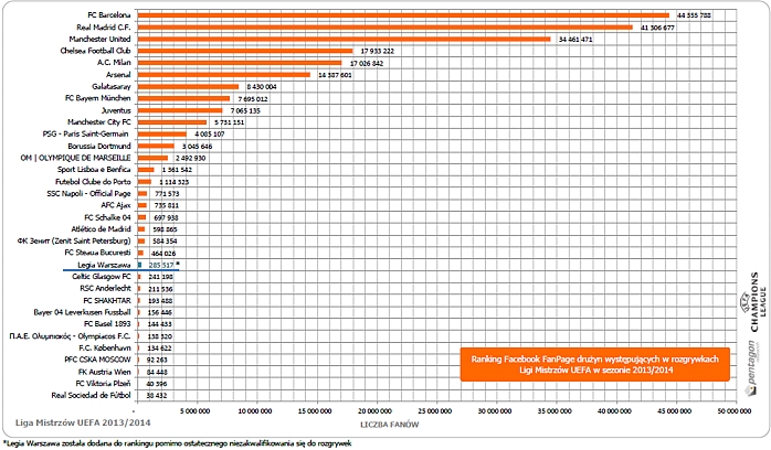 Gdyby Legia Warszawa awansowała do najbardziej prestiżowych rozgrywek w Europie znalazłaby się na 22 miejscu z wynikiem 285 517 fanów, zostawiając w tyle takie zespoły jak Celtic Glasgow (241 198), Bayer 04 Leverkusen (156 446), czy Olympiacos Pireus (138 320). Bezpośredni konkurent zespołu z Warszawy, który znalazł się w Lidze Mistrzów UEFA – FC Steaua Bukareszt uplasował się o jedną lokatę wyżej na 21 miejscu z 464 026 „Lubię to” oficjalnego profilu na Facebooku.