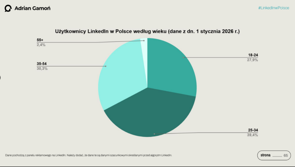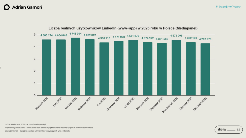 Być może najważniejszą zmianą, jaką obserwujemy w 2026 roku, jest ewolucja samej natury platformy. Dane z Mediapanelu (Gemius), które po raz pierwszy tak szeroko omawiam w raporcie, pokazują, że LinkedIn to nie tylko „społecznościówka”.