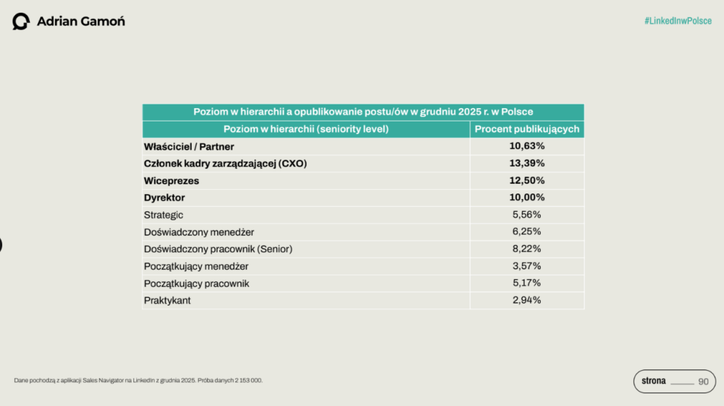 Jednak fizyczna obecność Gen Z na platformie nie przekłada się na ich głos. Analiza aktywności według poziomu w hierarchii (seniority level) nie pozostawia złudzeń. Najniższy odsetek publikujących treści notujemy właśnie wśród praktykantów (2,94%) i początkujących menedżerów (3,57%).