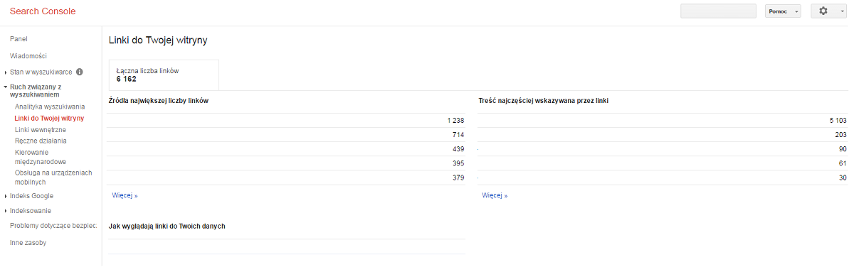 Google Search Console – podstawowe narzędzie każdego właściciela serwisu. Dzięki zakładce Linki do Twojej witryny możemy przeanalizować: