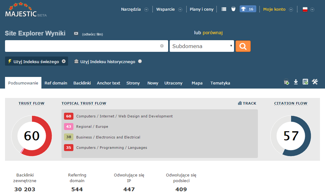 • ich parametrów Trust Flow i Citation Flow (wskaźniki Majestic SEO, które określają jakość i ilość linków prowadzących do domeny/subdomeny, na jakiej osadzony jest nasz link zwrotny).