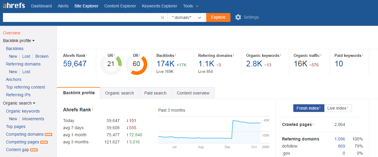 Ahrefs – kolejne płatne narzędzie, które posiada wiele podobnych funkcji jak Majestic SEO. Wśród danych dostarczanych przez Ahfres można wyróżnić m.in.: