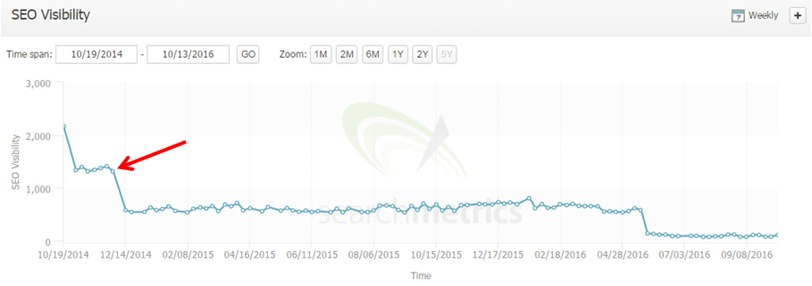 Poniżej prezentuję wykres widoczności SEO serwisu, który zanotował spory spadek po aktualizacji Pingwina w 2014 r.: