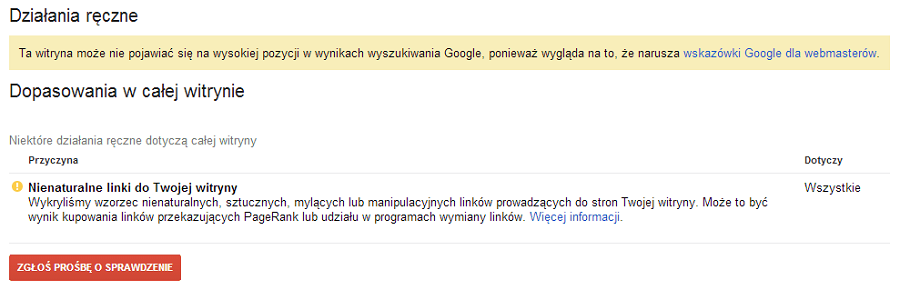 Poniżej informacja o nałożeniu na serwis kary ręcznej za spamowe linki: