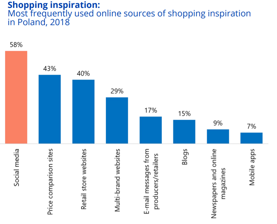 Współczesny konsument jest obecny w wielu miejscach w sieci codziennie, często – równocześnie. Za pośrednictwem jakich kanałów zatem najlepiej do niego dotrzeć? Skąd czerpie inspiracje zakupowe? Okazuje się, że tak jak w wielu innych dziedzinach, najważniejsza jest obecność w mediach społecznościowych. Ponad połowa internautów (58%) właśnie tu daje się zainspirować (i skusić). Wiele osób korzysta również z porównywarek cenowych (43%), ale niewiele mniej skuteczne w kreowaniu podpowiedzi zakupowych są same witryny sklepów internetowych. Wyświetlanymi na nich informacjami sugeruje się 40% kupujących.